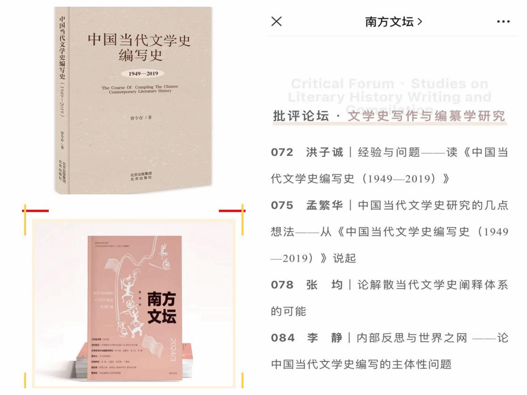 继《中国当代文学史编写史1949—2019》(以下简称《编写史》)新书发布暨研讨会后,近日《南方文坛》(CSSCI来源期刊)开辟“文学史写作与编纂学研究”专栏,刊发北京大学洪子诚教授、沈阳师范大学孟繁华教授、中山大学张均教授、中国艺术研究院李静副研究员4位学者文章,评介我校曾令存教授的《编写史》。