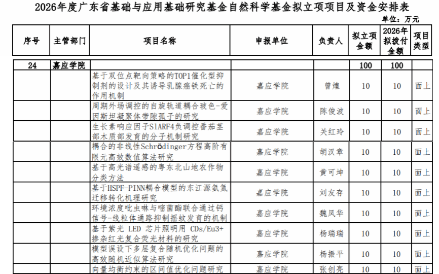 近日,2026年度广东省基础与应用基础研究基金自然科学基金项目立项结果正式公布,我校在本次申报工作中表现突出,共获批面上项目10项,获资助经费总额100万元,立项数量与资助金额持续增长,体现出学校在基础研究和应用基础研究领域的持续积累与良好发展态势。