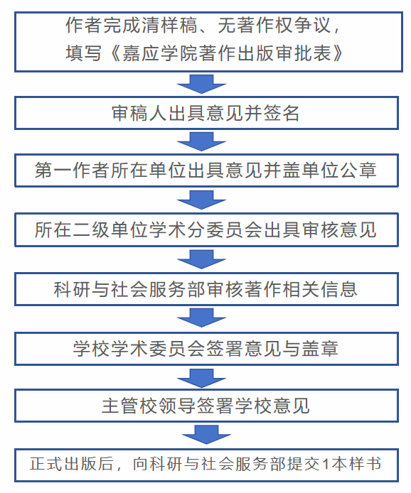 事项名称嘉应学院著作出版服务对象教师责任部门科研与社会服务部责任科室综合科服务内容规范学校教职工著作出版管理,引导和支持广大教师著作出版。办理形式线上+线下受理时间工作日业务周期常年办结时限7个工作日办结办理地点何侨生大楼407室负责人员廖嘉玲咨询电话0753-2189639办事流程图所需材料《嘉应学院著作出版审批表》办事依据根据《嘉应学院著作出版管理办法(试行)》制度(嘉院科〔2024〕2号)。注意事项